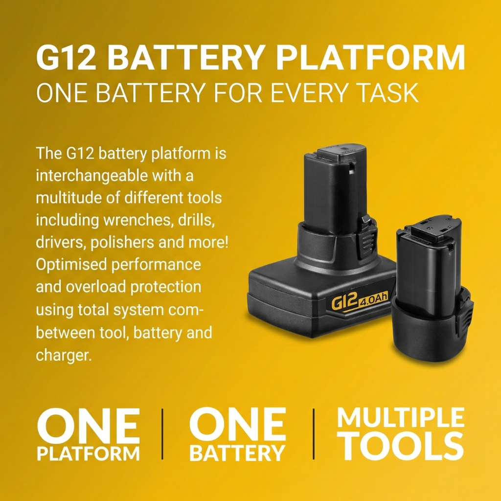 • G12 BATTERY PLATFORM – Uses G12 batteries, which is compatible with all G12 family tools: ratchet wrench, impact wrench, drill driver & polisher with more to come.